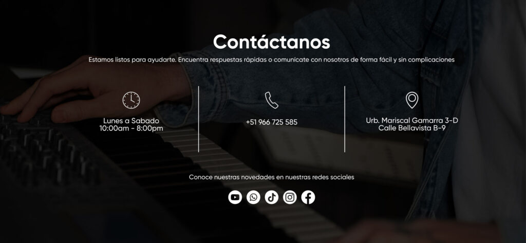 Rodrigo Genaro Gamarra Grossmann1. Septiembre, 2023. Nohemi Jimenez27. Abril, 2023. Mariana Gil26. Abril, 2023. Jelanny Condori Huillcahuaman8. Abril, 2023. Cristh729. Marzo, 2023. Exelente atención encuentras de todo lo que puedas necesitar para tu guitarra y de todas las variedades Noe Garcia Escobar9. Marzo, 2023. Gran variedad de accesorios y respuestos para diferentes tipos de instrumentos musicales, mucha amabilidad por parte del personal. Angel Perez16. Febrero, 2023. Muy buen lugar Ludguer Warthon18. Enero, 2023. Buen servicio