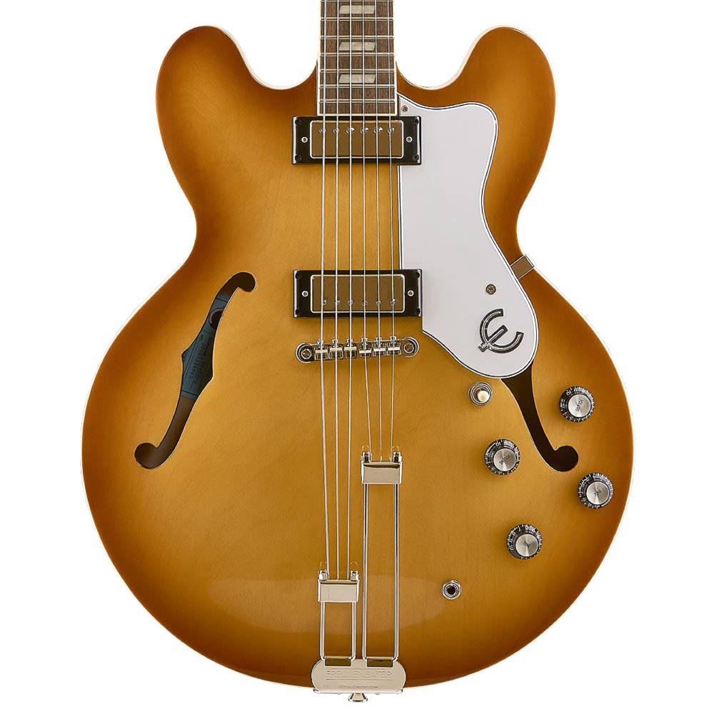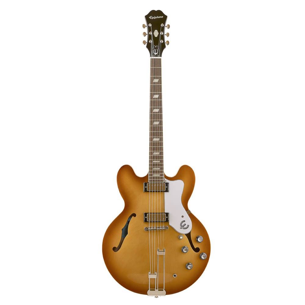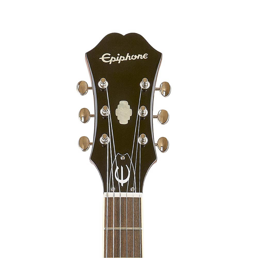 La máxima expresión de la elegancia en guitarras semi-hollow. Cuerpo de arce laminado con bloque central y pastillas Epiphone ProBucker Mini-Humbucker que ofrecen brillo y claridad. Destaca por su cordal Frequensator histórico, herrajes dorados y la icónica incrustación “Tree of Life” en el clavijero. Un clásico del jazz y el blues refinado.